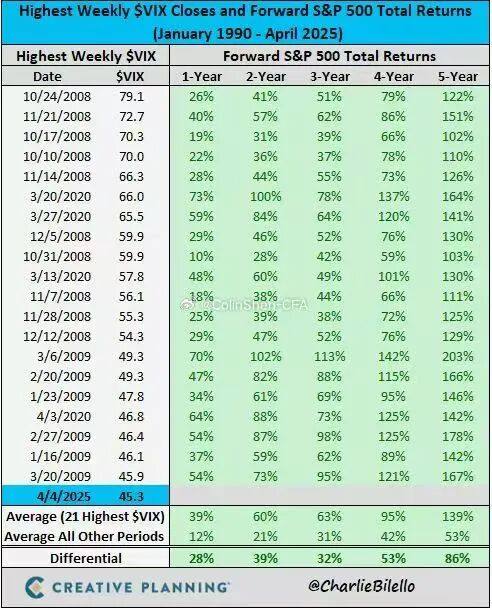 那么当VIX突破45后,市场在短期到中长期会如何表现呢?从下面这张图的统计看到,VIX突破45后的标普500指数一年到五年都有非常不错的绝对回报。