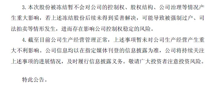 这一动作释放出的信号较为明确:上市公司层面已经开始与控股股东风险进行隔离,并试图通过司法程序保护自身及中小股东利益。与此同时,公司在股份冻结公告中也明确表示,截至目前生产经营管理正常,上述事项暂未对公司生产经营产生重大不利影响。
