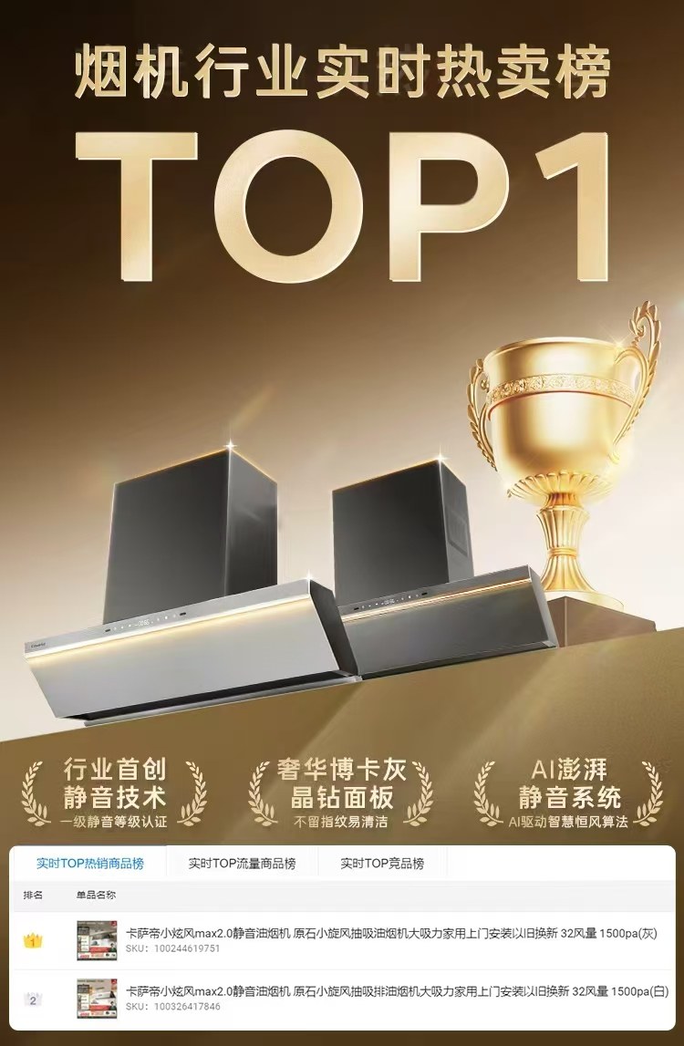 卡萨帝厨电品质焕新节热潮之下,高端烟机市场再掀爆款旋风。卡萨帝小炫风Max2.0油烟机上市即交出亮眼答卷,首发28小时销量超3000台,3月份斩获京东5500 +价位段热卖榜TOP1,更凭单型号6.7%的份额登顶中怡康单周行业第一。这份战绩,既是用户的认可,也是卡萨帝厨电深耕用户需求、践行海尔智慧家庭战略的有力印证。